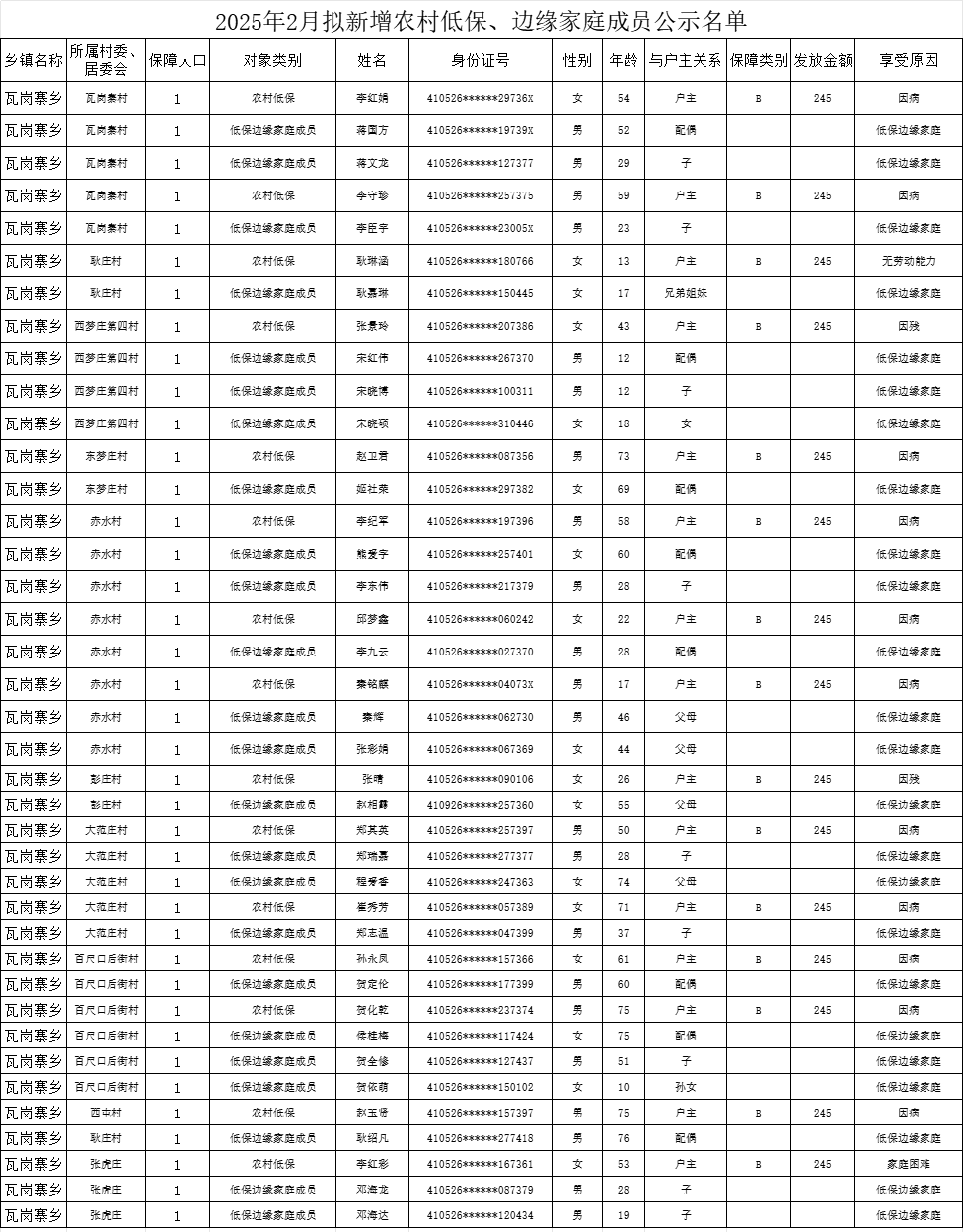 瓦岗寨乡2025年2月拟新增农村低保、边缘家庭成员公示名单